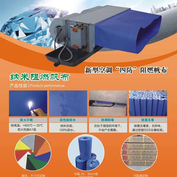 納米阻燃帆布,空調專(zhuān)用風(fēng)筒布,空調專(zhuān)用帆布規格:1.2cm*30cm,厚度:0.3mm,耐高溫200℃。顏色:藍色。防火、防水、防潮防霉,防菌。